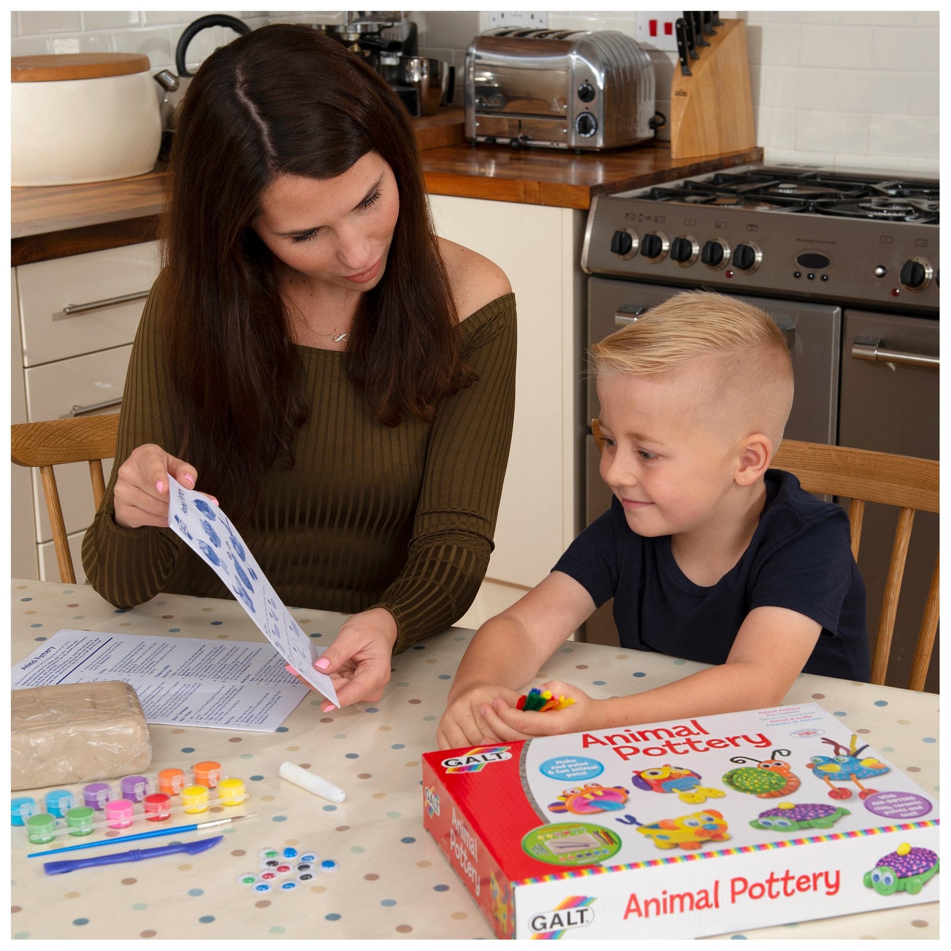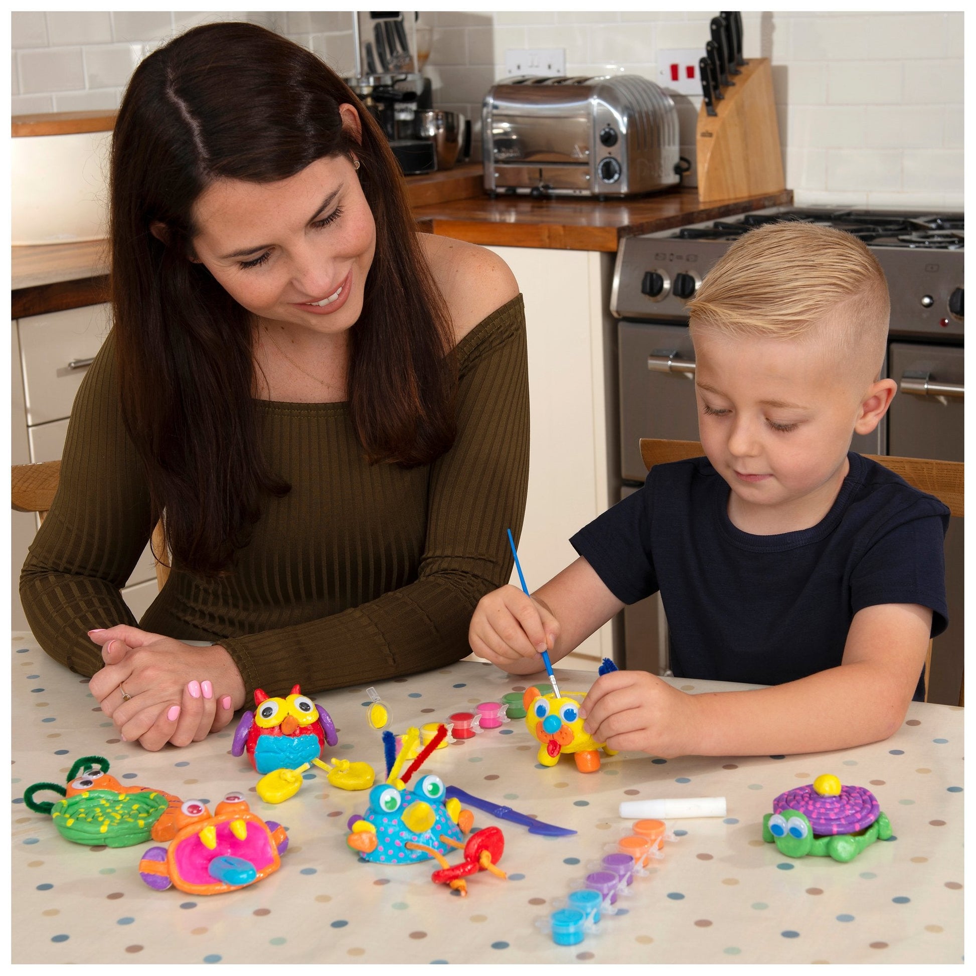 Contents: 1.2kg air-drying clay, 12 x 2.3ml ceramic paints, modelling tool, 10 pipe cleaners, 4 lengths of cord, 12 wiggly eyes, glue, paintbrush and guide.