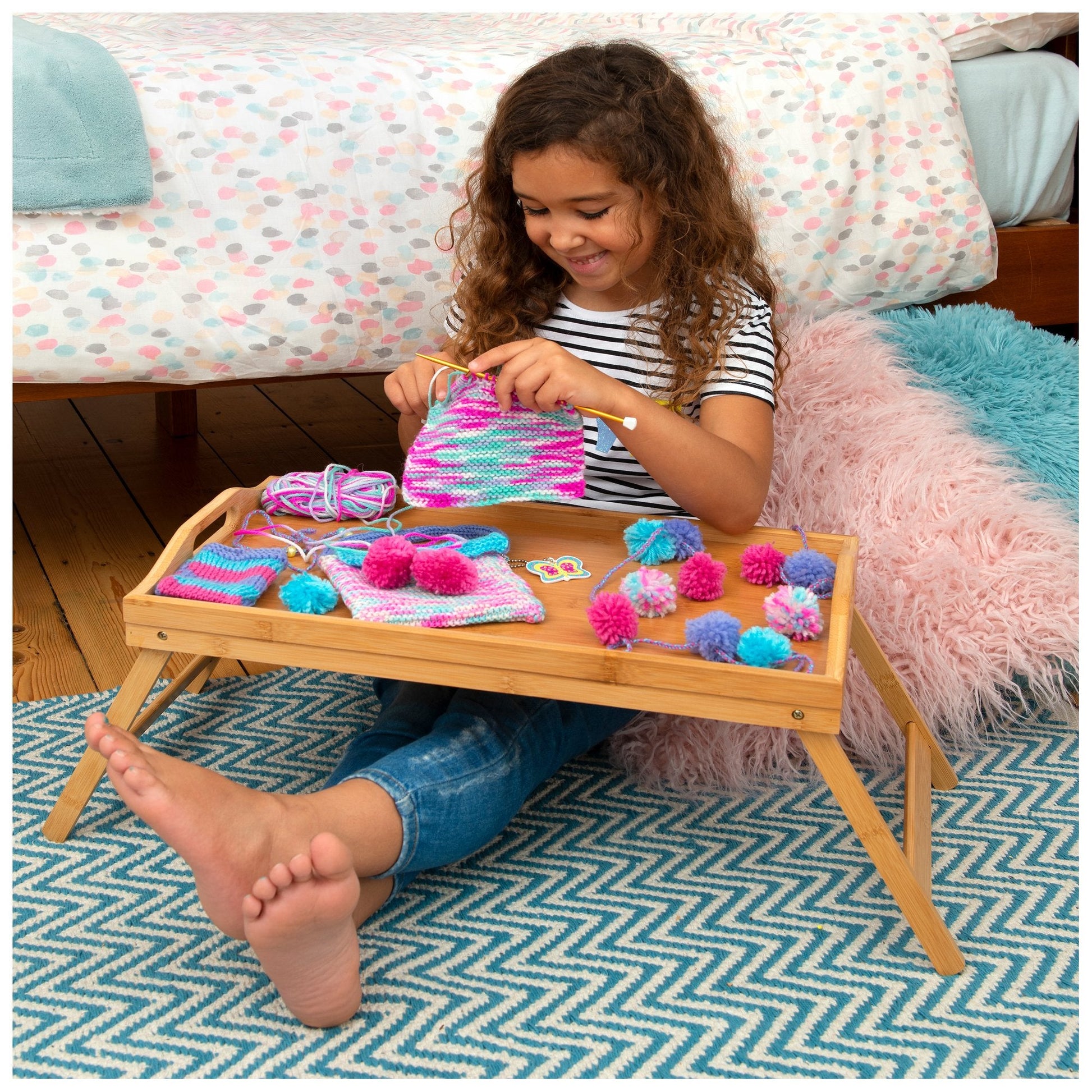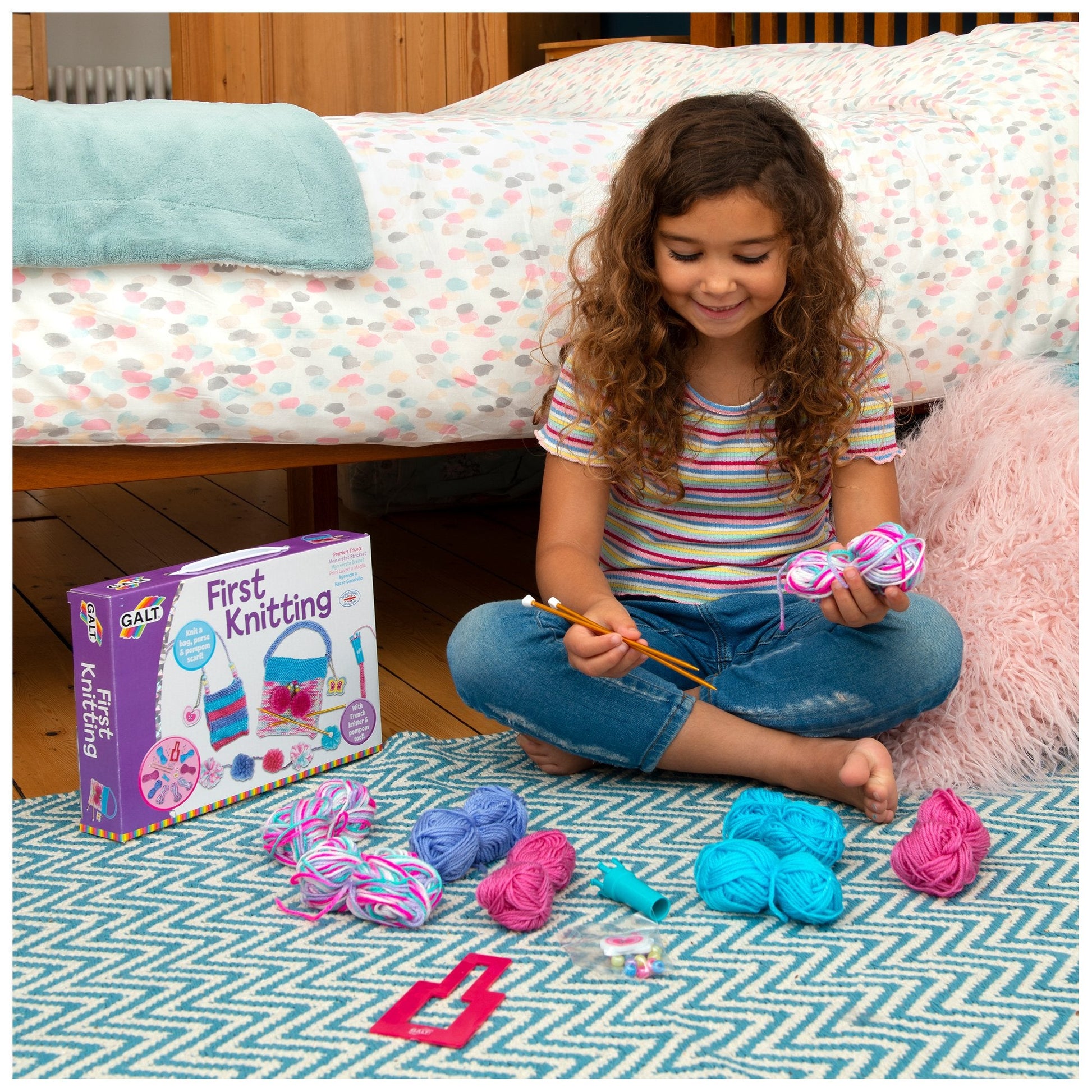 Create a knitted bag, cute purse and fun pompom scarf using the French knitter, knitting needles and pompom tool. Learn how to knit using the detailed step by step guide. Contents: 8 balls of wool, knitting needles, French knitter, pompom tool, beads, bodkin, guide.