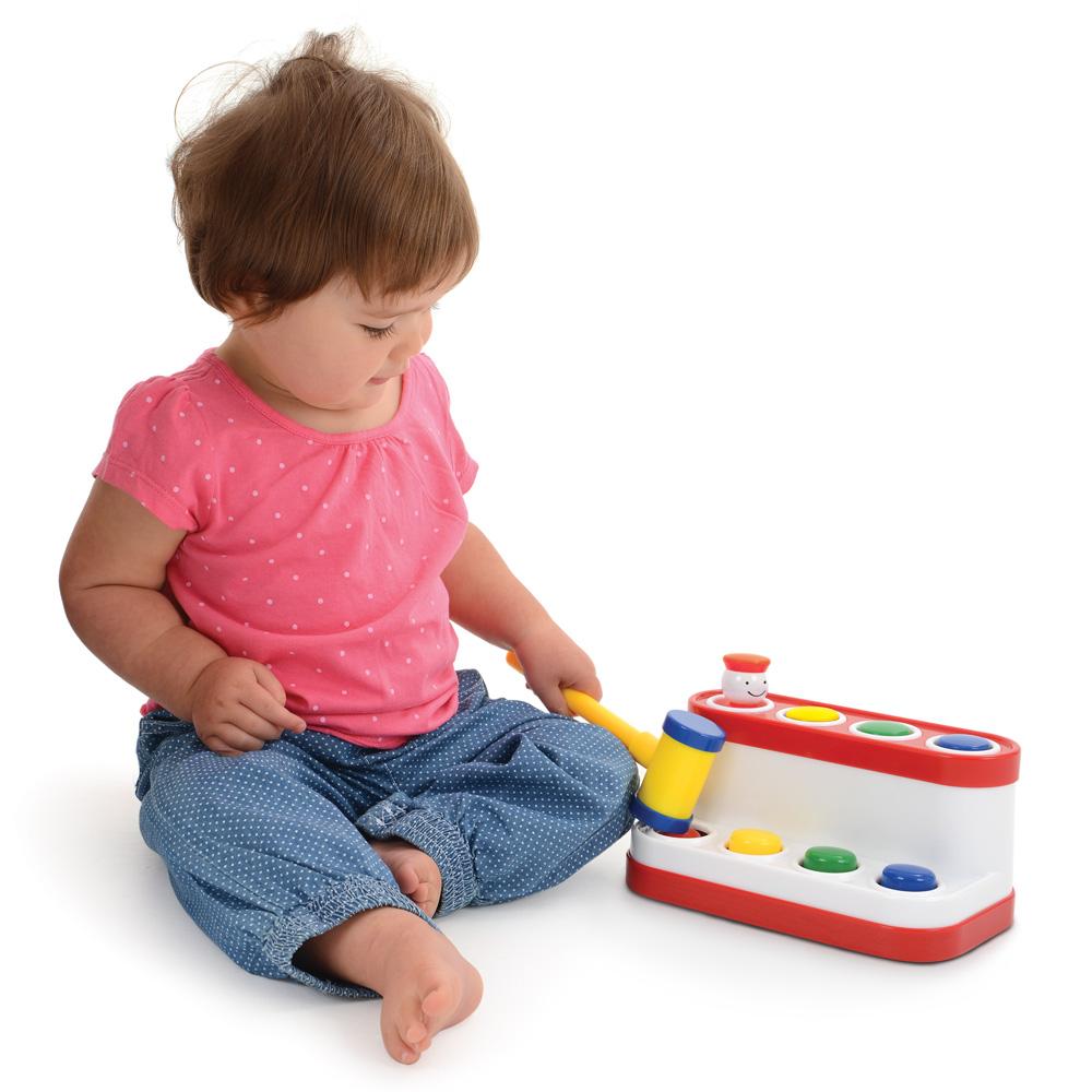 Tap a button with the hammer and the matching coloured pal pops up. Repeat the fun game of peep-o with the foursmiley pals. Helps develop hand-eye coordination and manual dexterity.